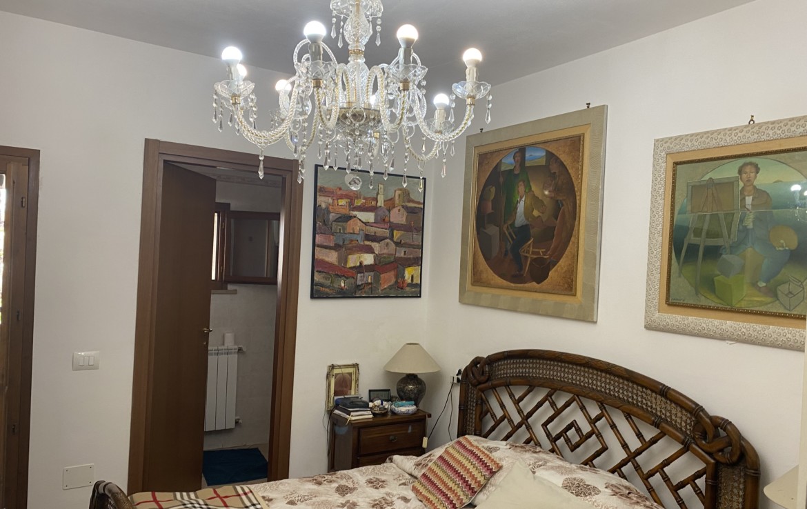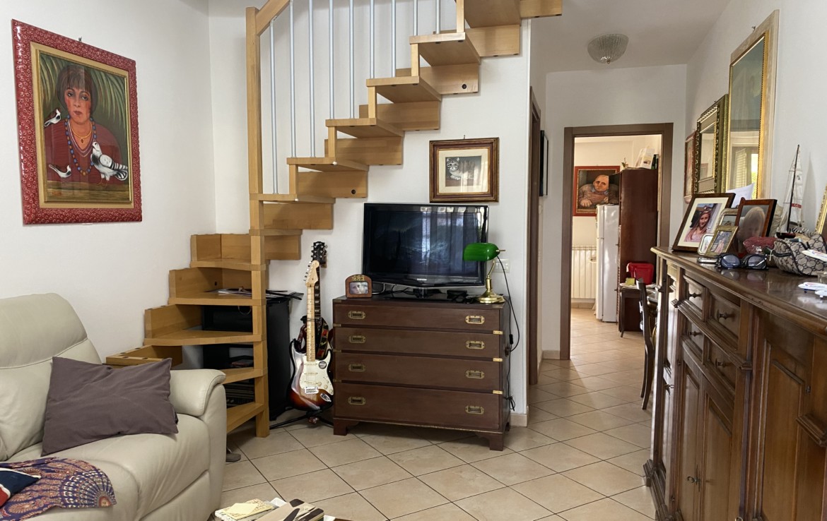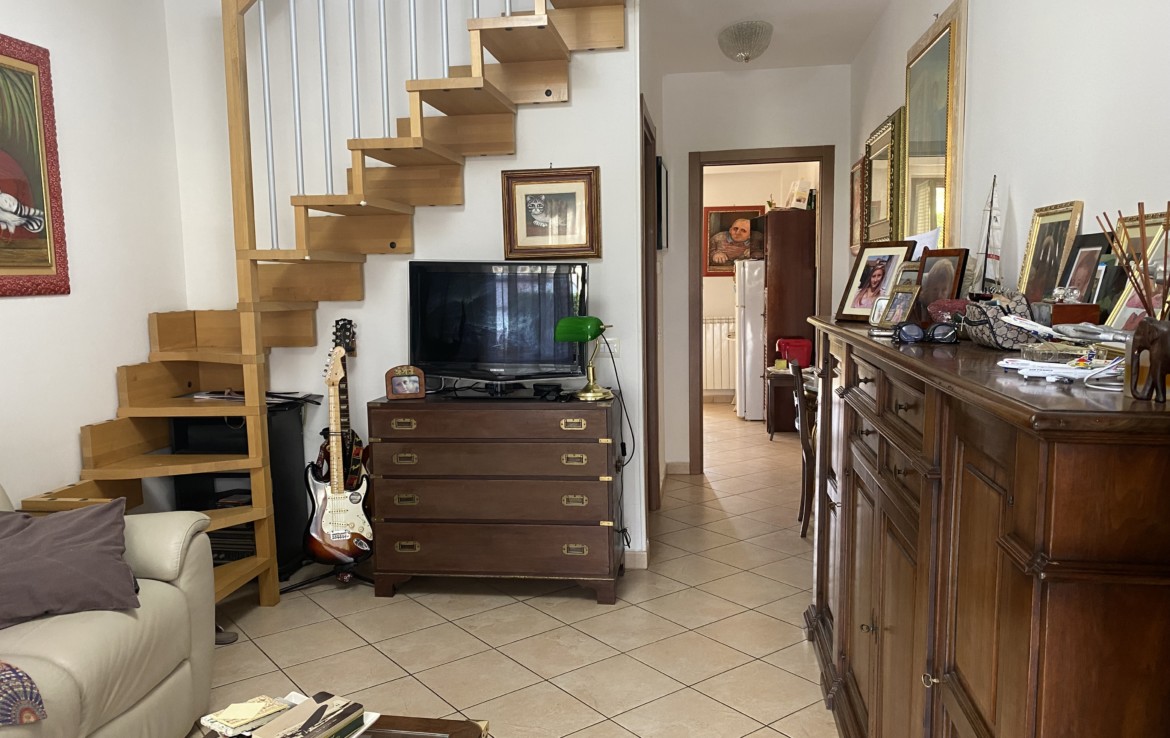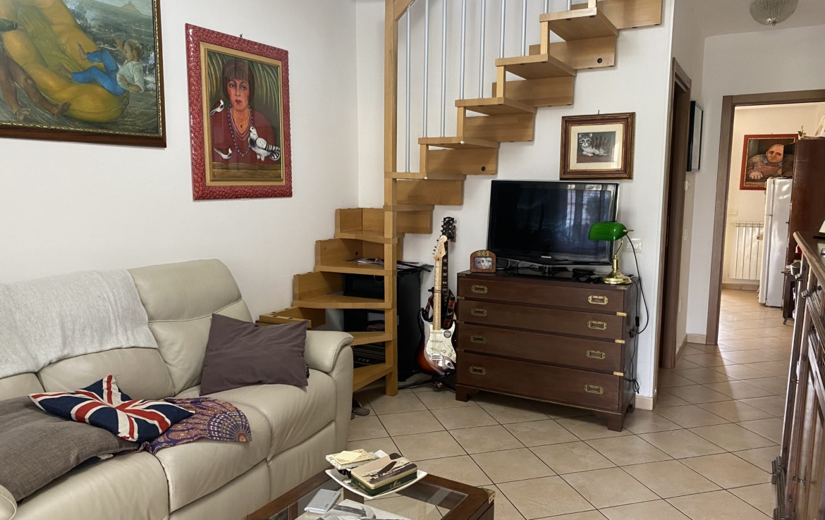 mediante la scala interna nel soggiorno si accede al piano superiore con la camera da letto, il secondo bagno con doccia e finestra, il terrazzo che guarda il giardino d’ingrtesso.