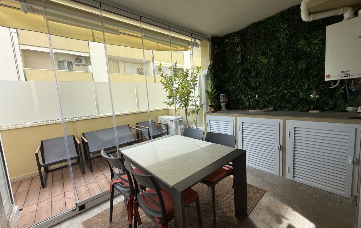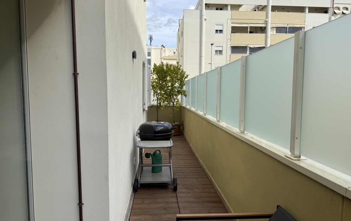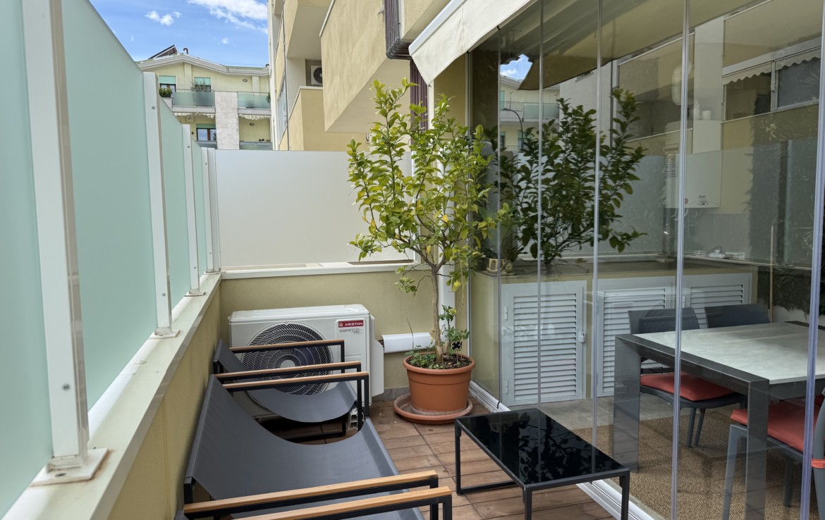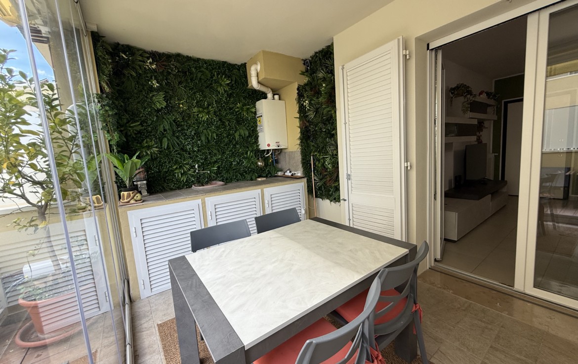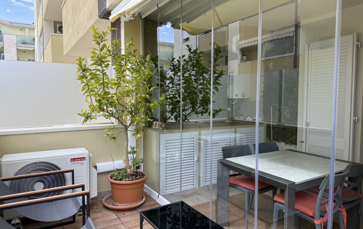 Dal soggiorno si accede alla terrazza ben organizzata con una zona in muraturo con il lavello, zona pranzo e zona relax.