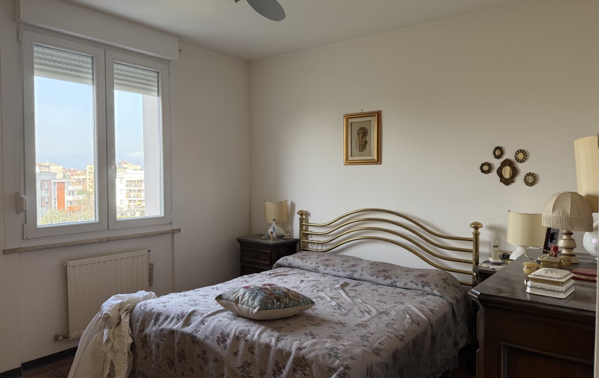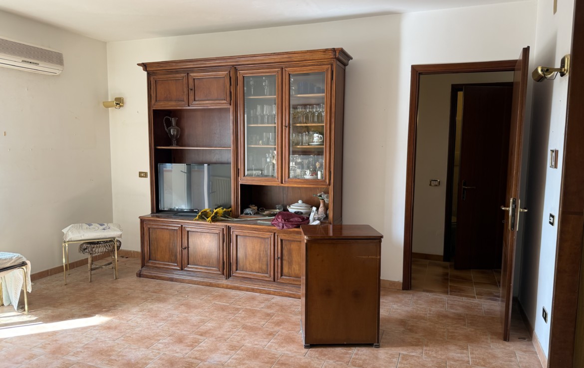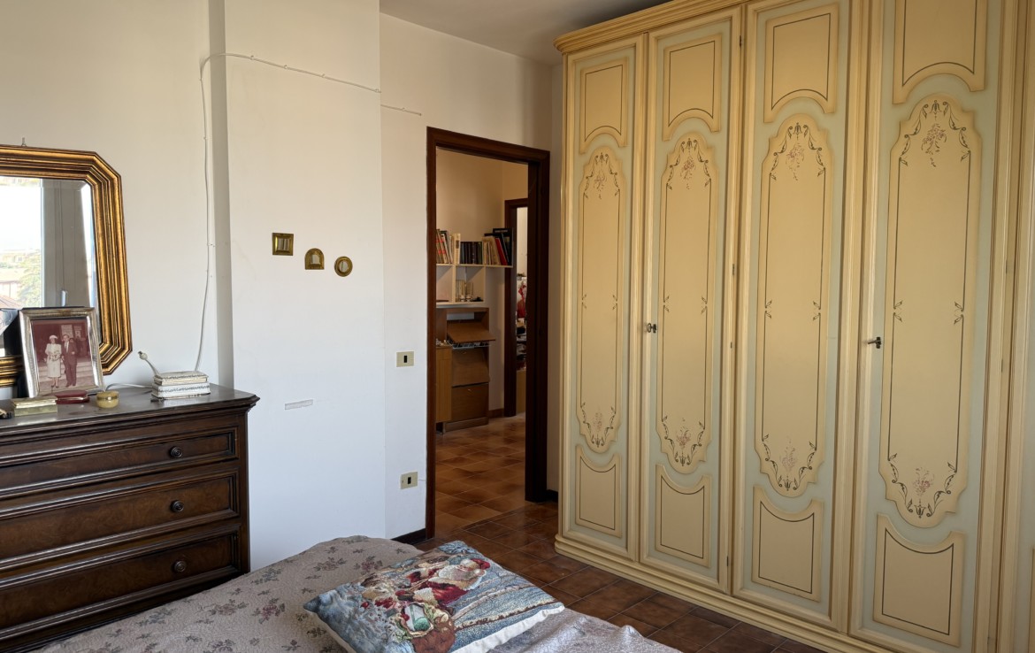 L’appartamento è attualmente diviso in un cinque vani con soggiorno, cucina abitabile, tre camere da letto, due matrimoniali e una doppia,